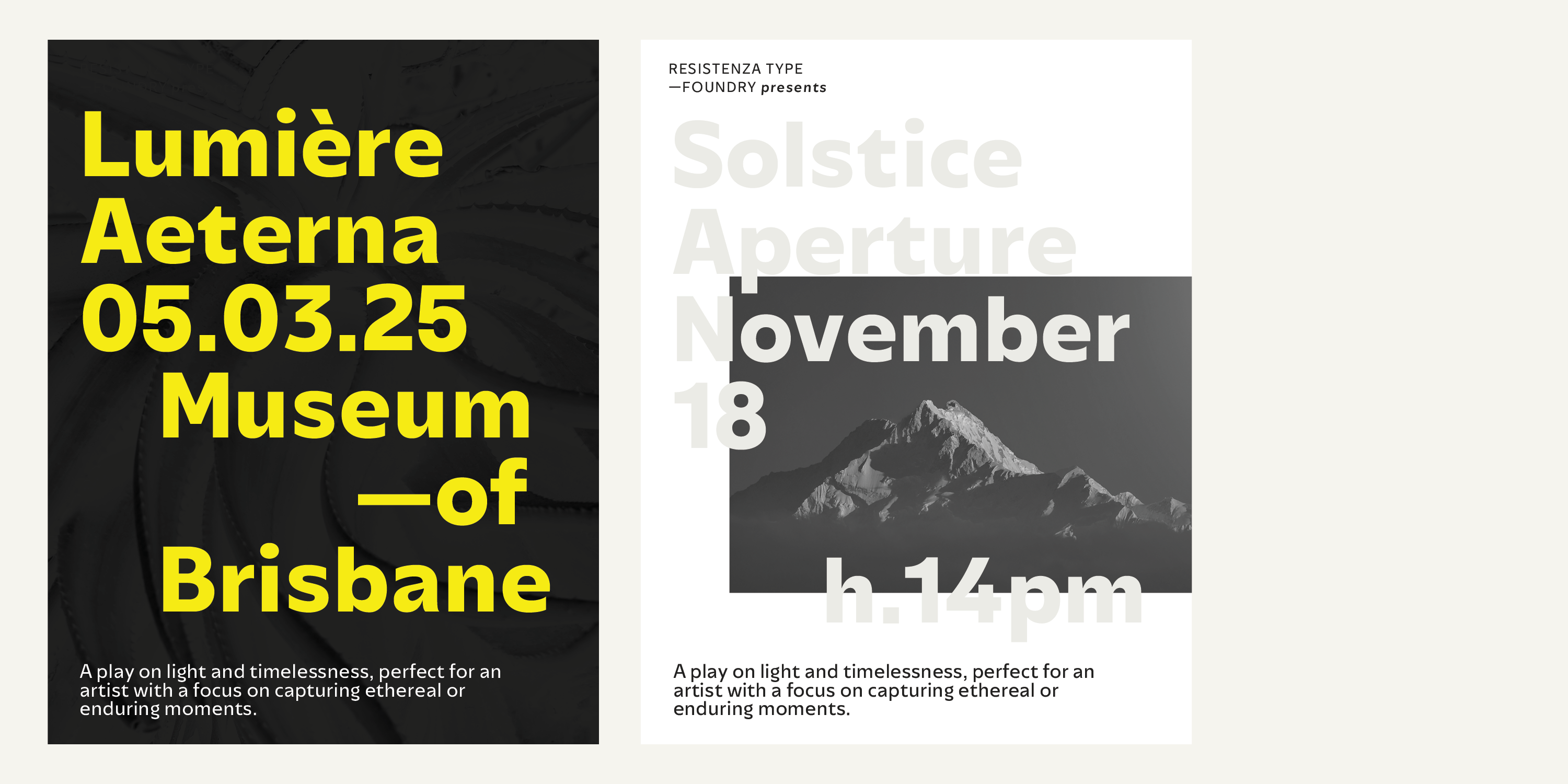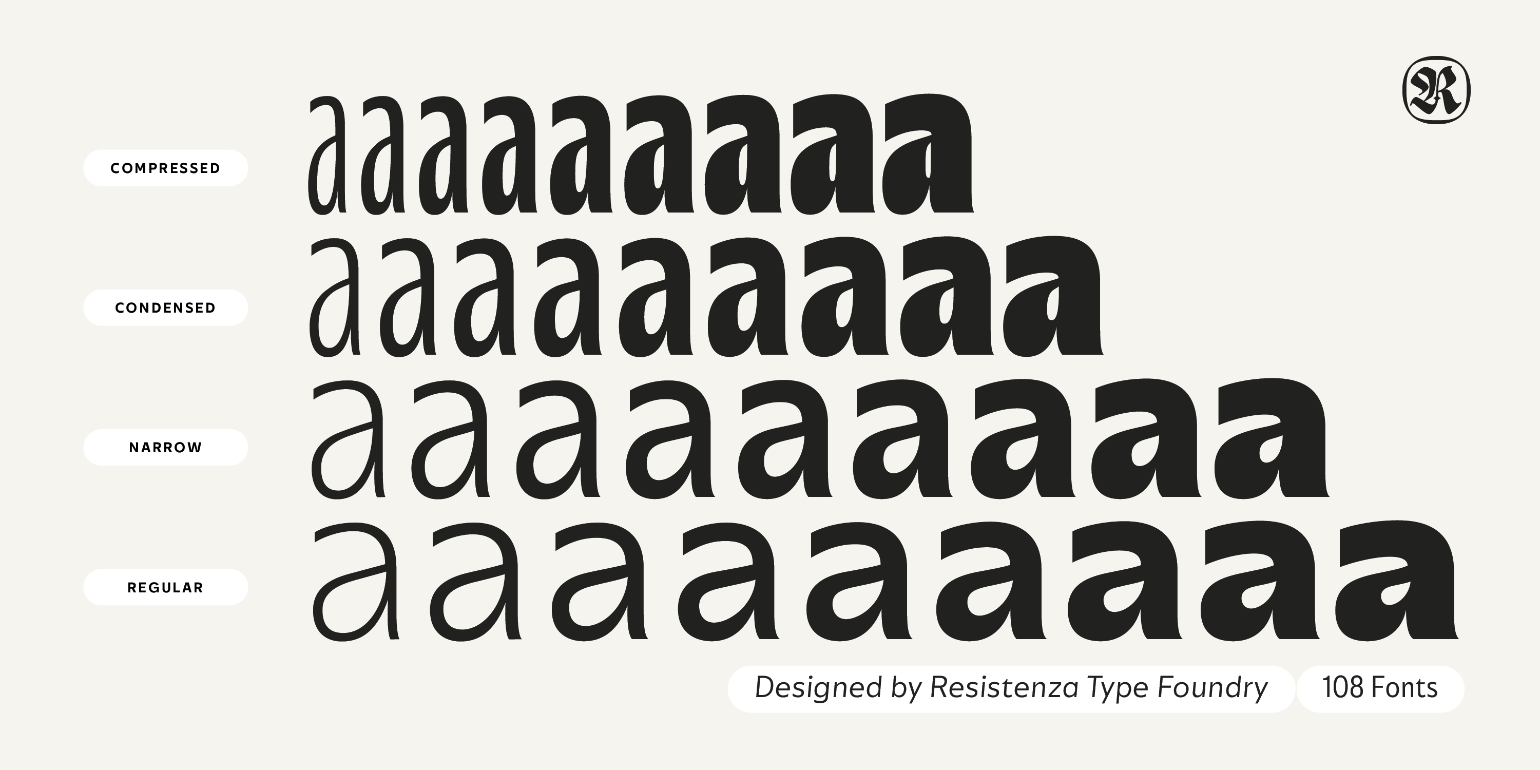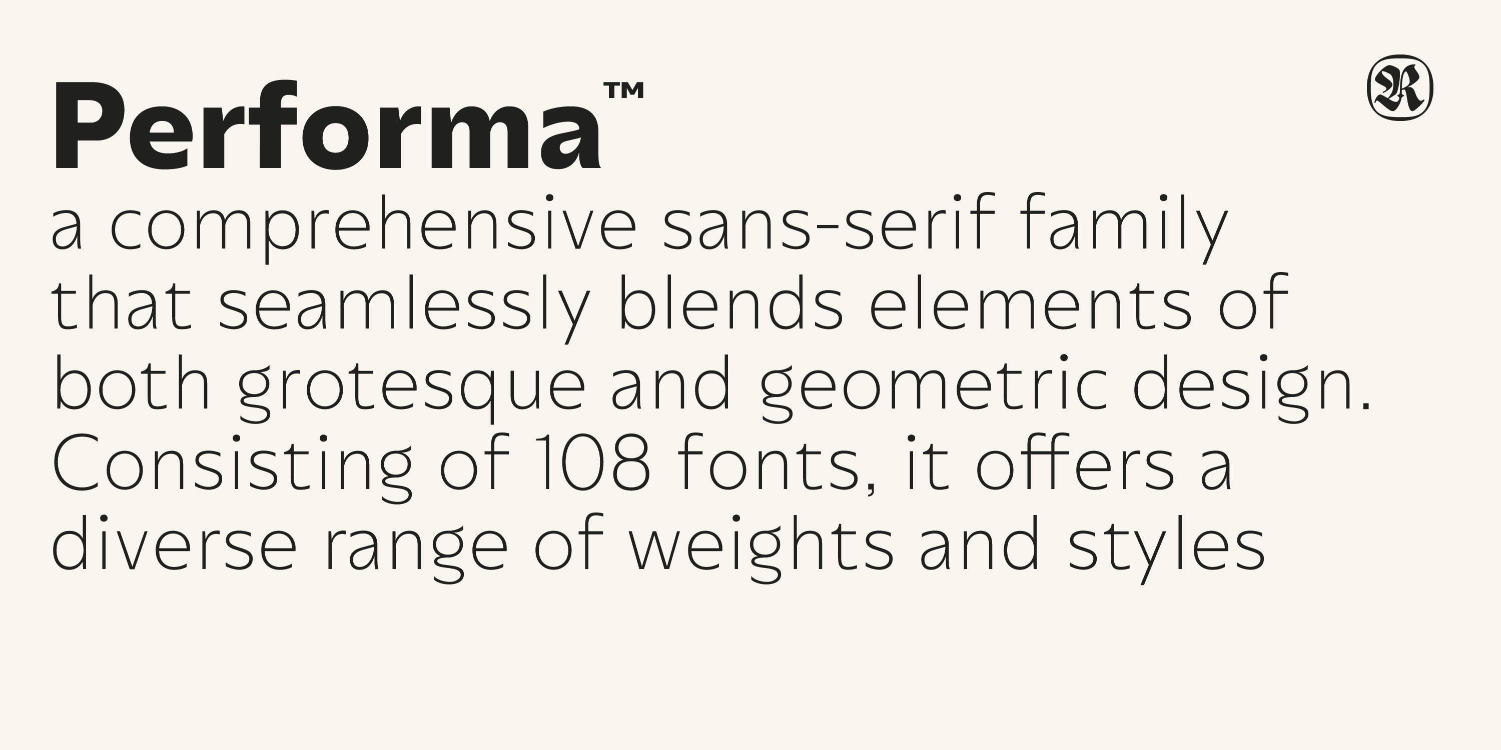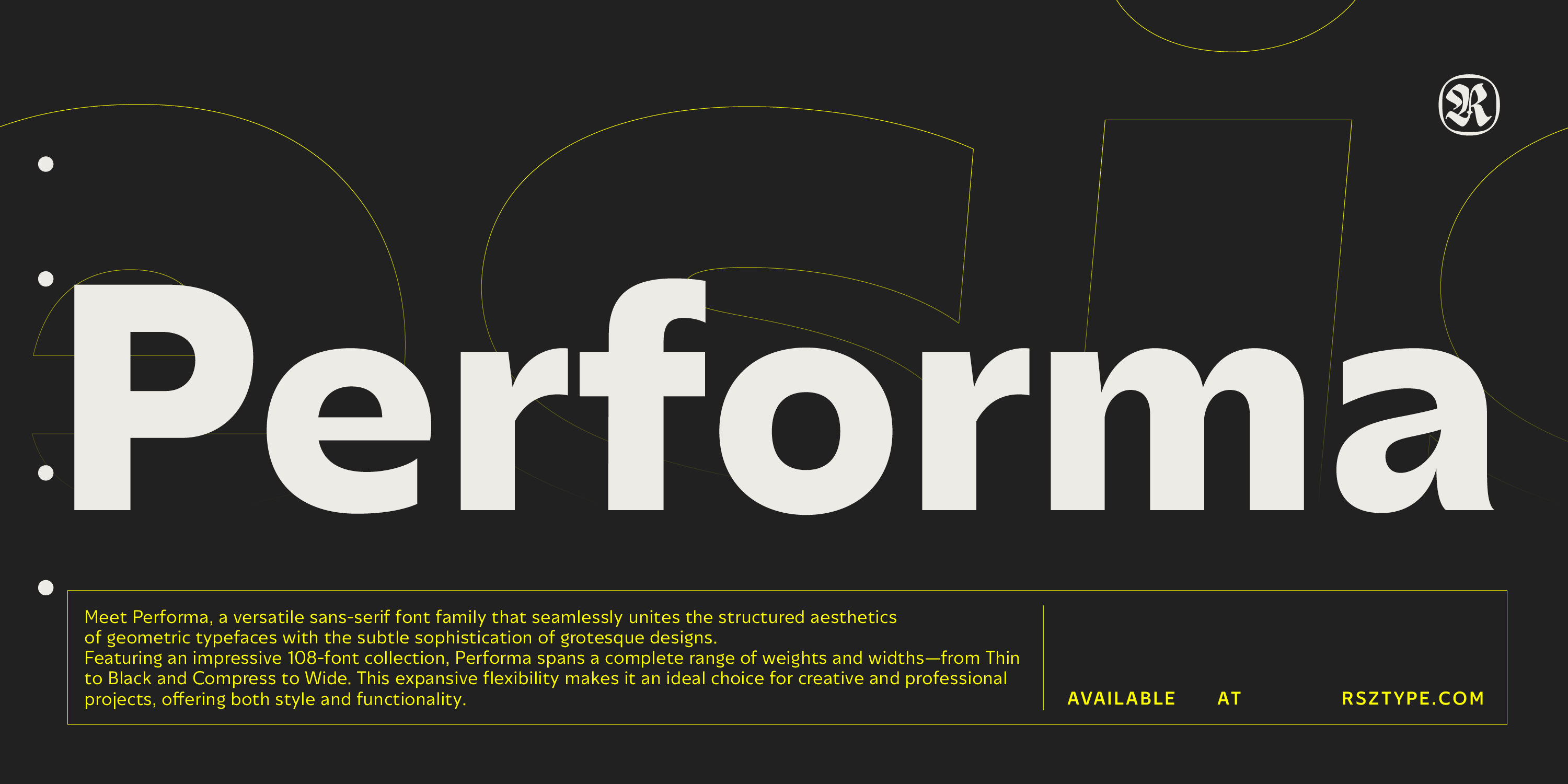 Designed by Resistenza Type FoundryIntroducing Performa, a comprehensive sans-serif font family that effortlessly marries the best of both grotesque and geometric design philosophies. With a remarkable collection of 108 fonts, Performa offers an extensive range of weights and styles, spanning from Thin to Black and Compress to Wide. This makes it a highly adaptable, elegant, and stylish choice for a variety of creative needs.
