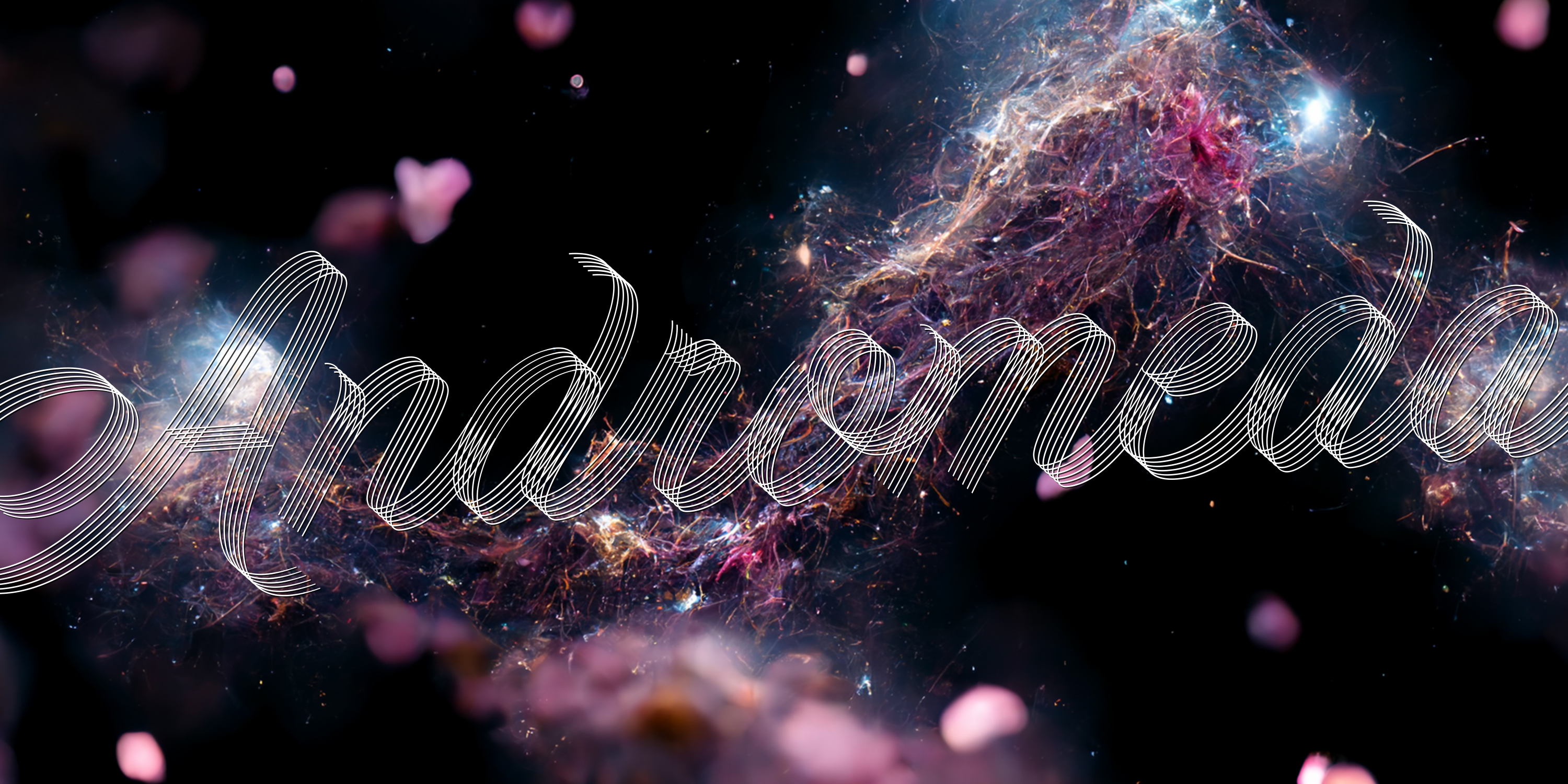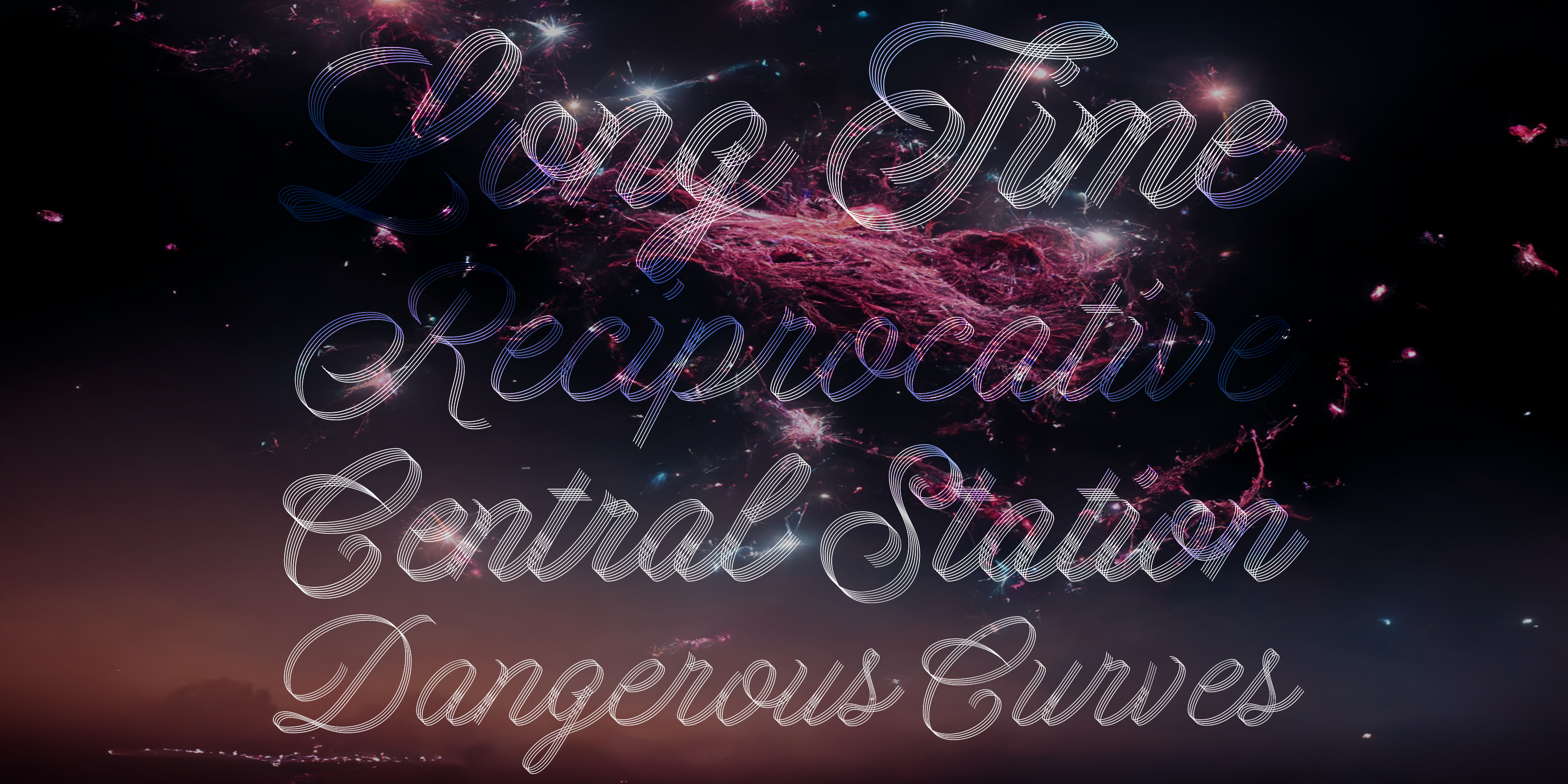 A modern approach to classic flourished scripts, designed with a slanted angle that gives dynamism and creates a ribbon effect when the lines come together in the connections, adding depth and perspective.