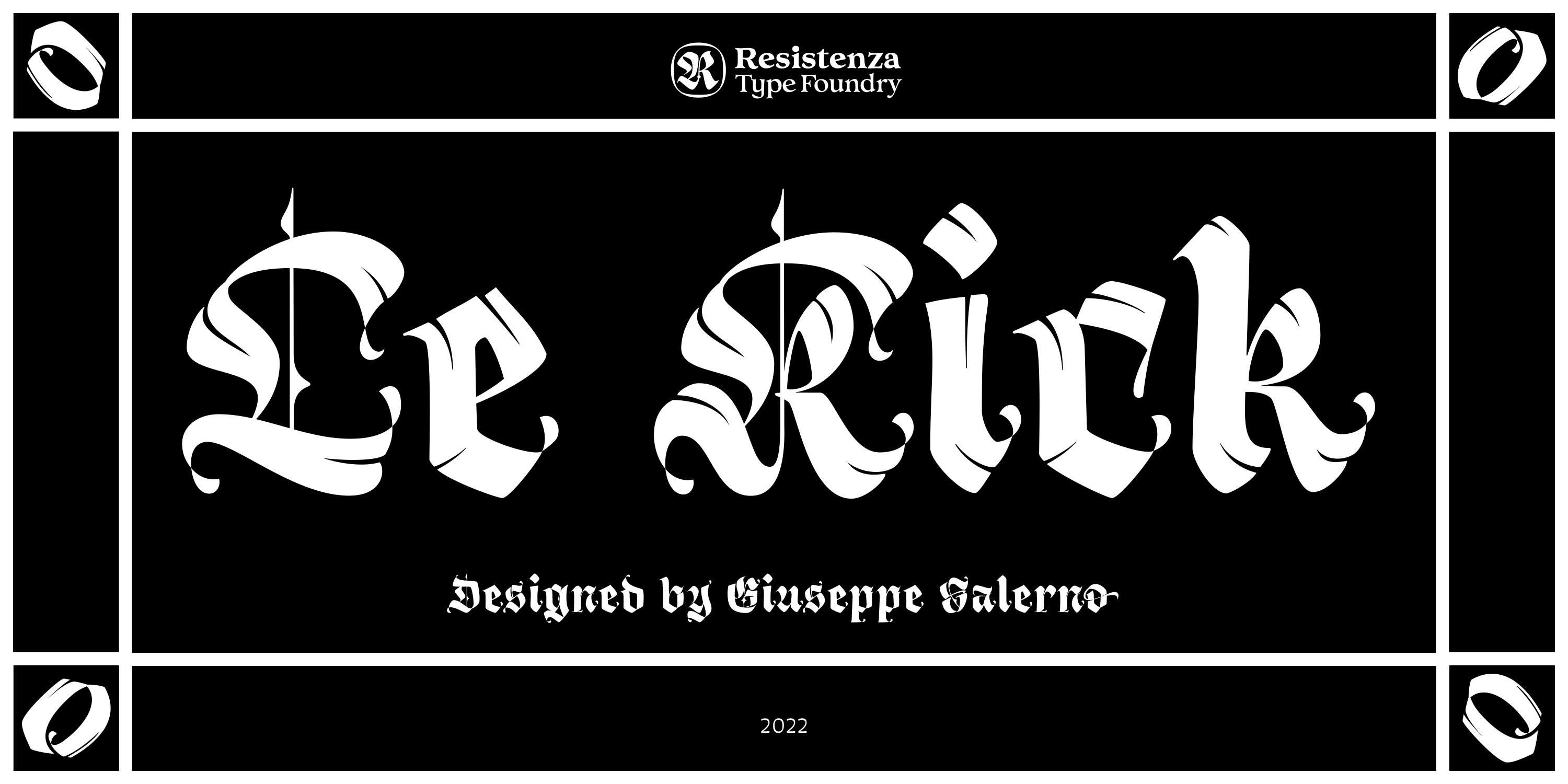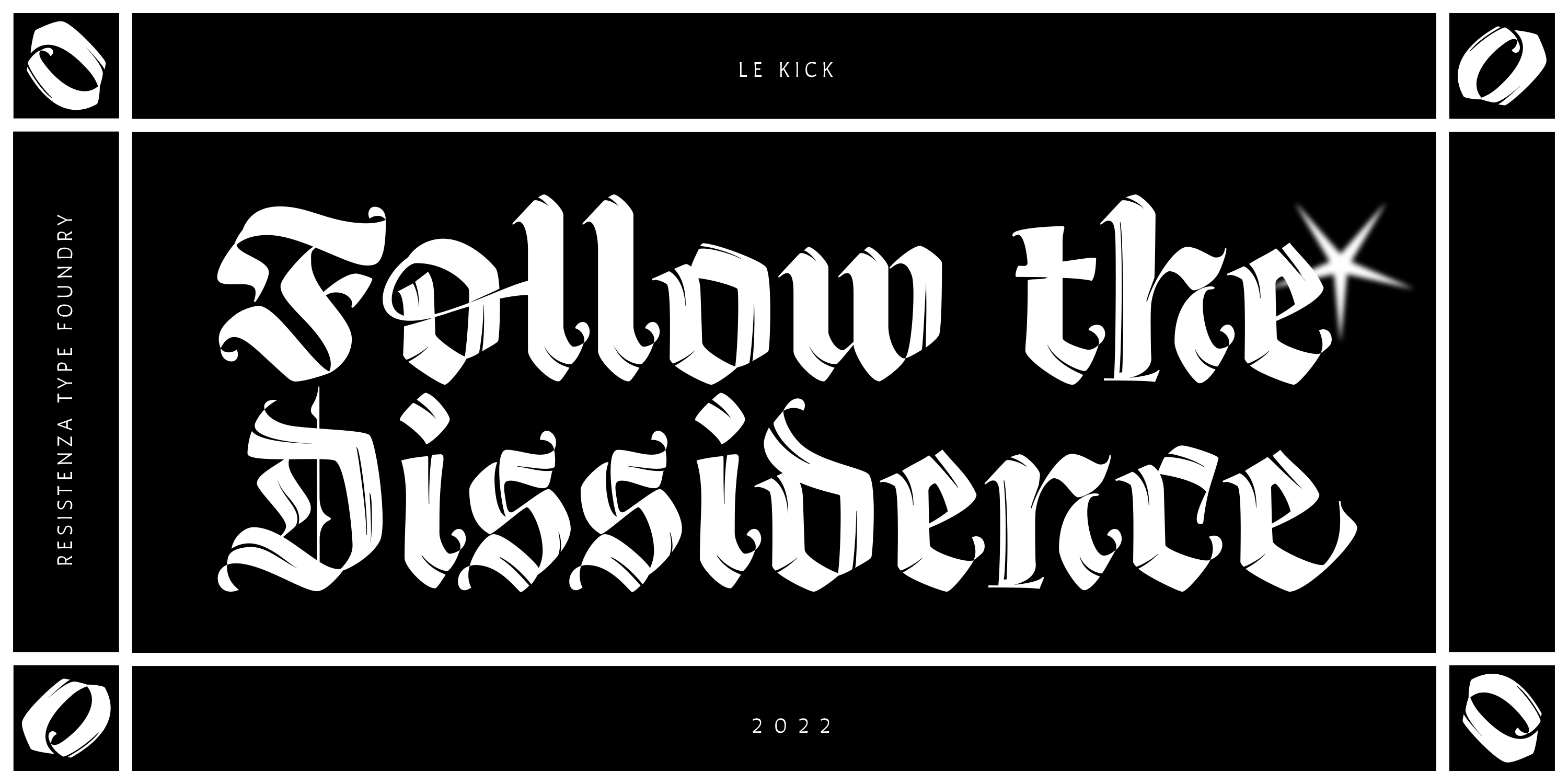 Designed by Resistenza Type FoundryIntroducing LeKick. Inspired by Fraktur script with a contemporary flare, LeKick is a blackletter display face. This font has been designed with a flat brush and ink, choose between two styles; Brush, which demonstrates the strokes and construction of each letterform, or Regular. The perfect typeface for typographic creations such as book covers, headlines, and banners.