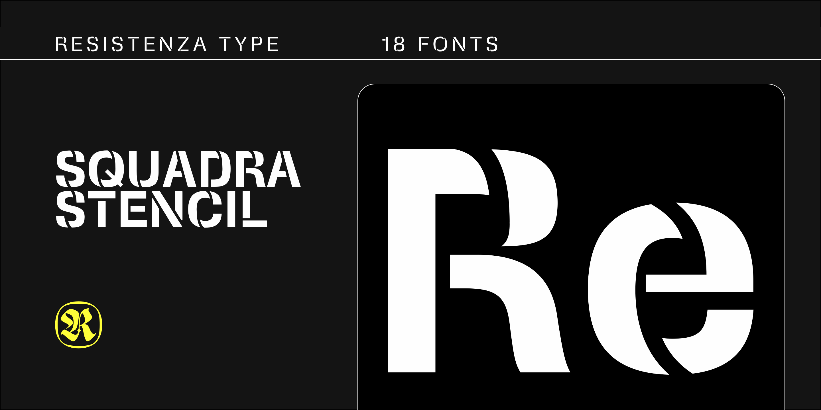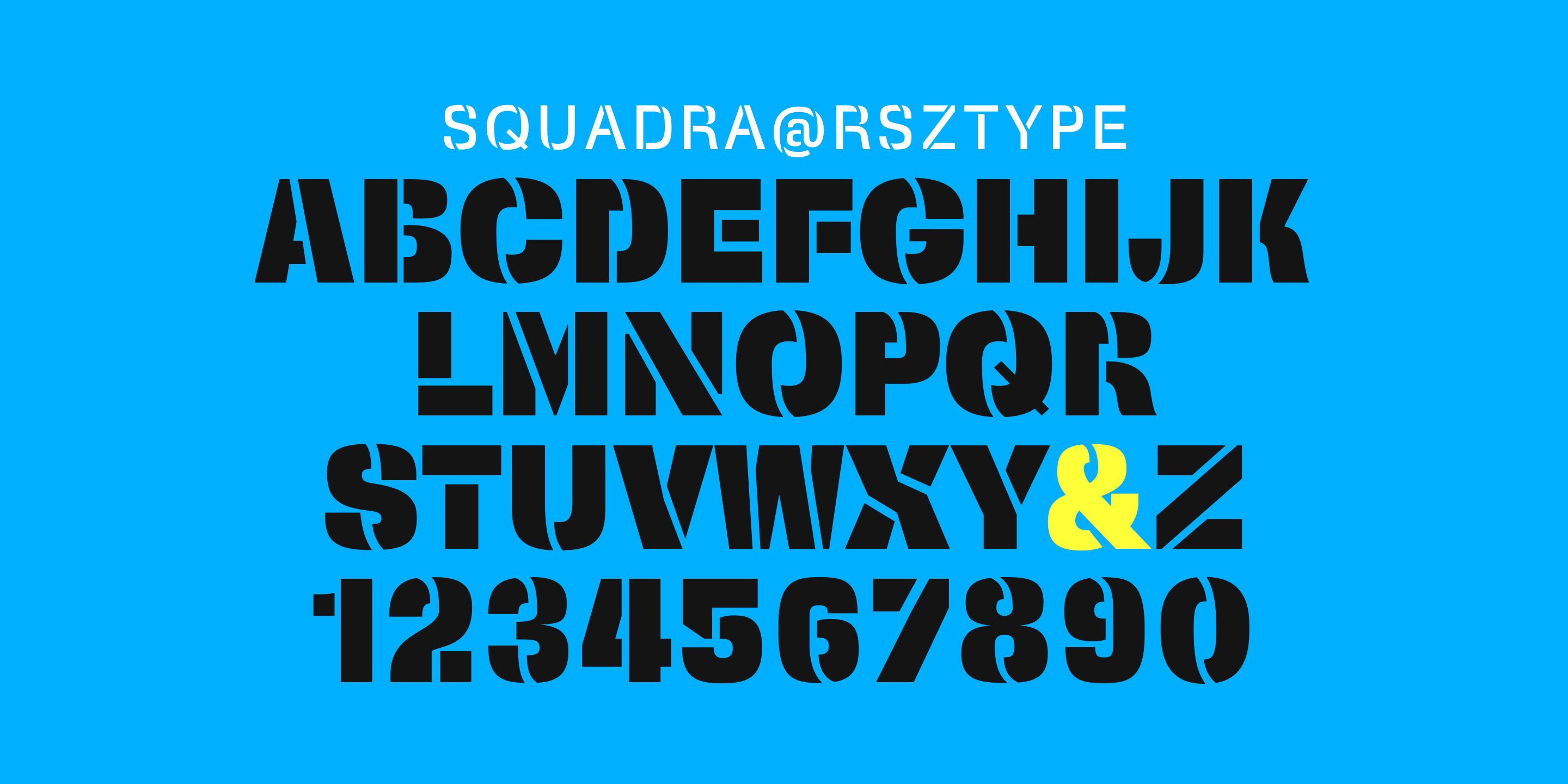 Designed by Resistenza Type FoundrySquadra Stencil is a bold and modern stencil typeface with a unique geometric and modular aesthetic based on our previous release Squadra.