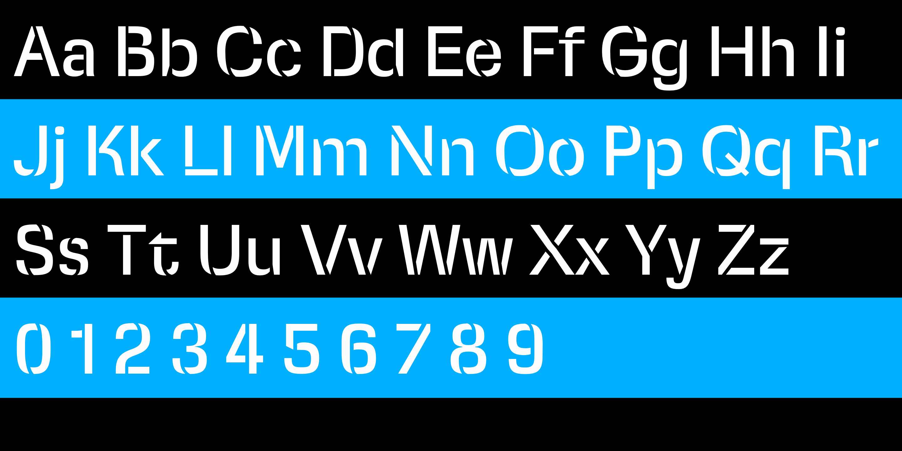 It features a strong rectilinear and angular structure, with precisely placed breaks in the letterforms that create the stencil effect while maintaining legibility.