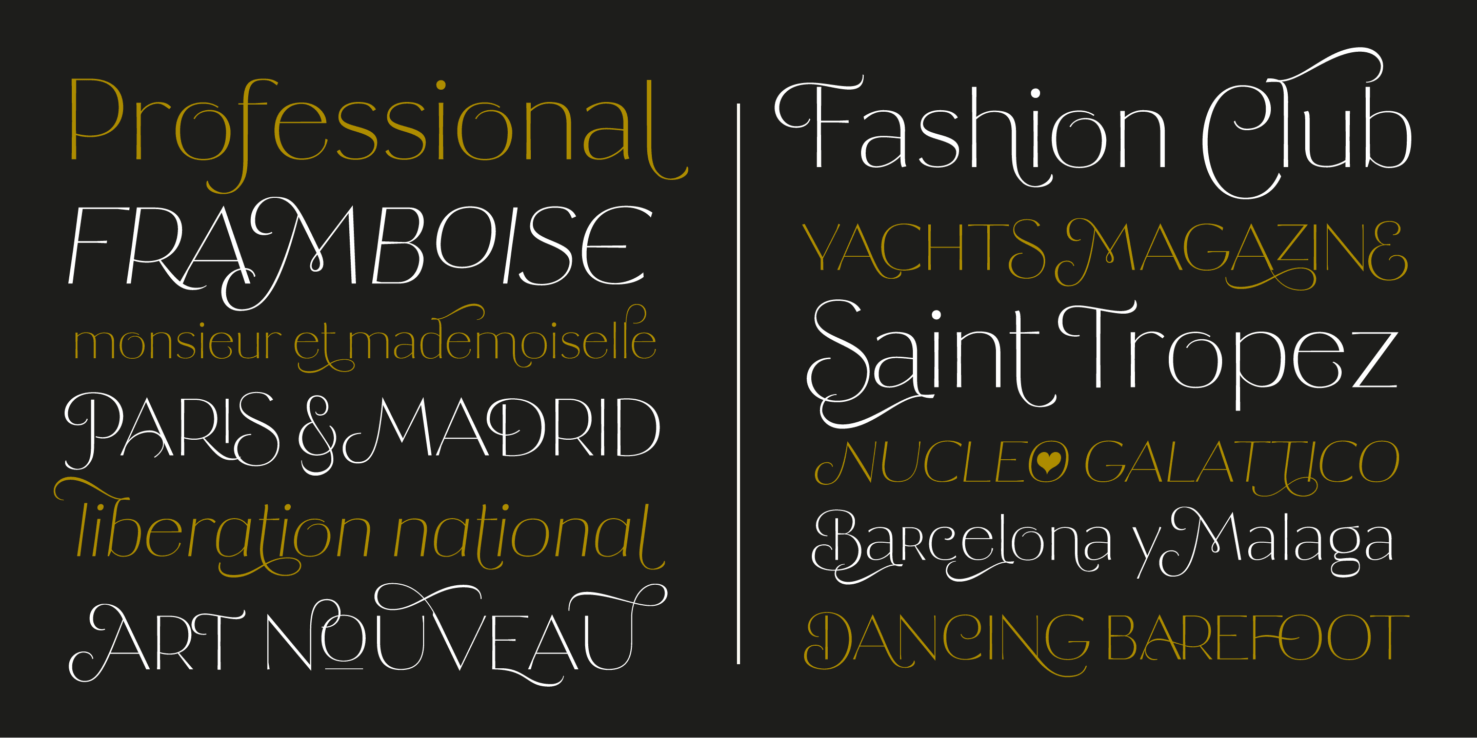 Tresor (meaning “treasure” in French), is full of jewels including a beautiful collection of swashes. More than 1000 glyphs accessible through OpenType features invite you to customise your test.