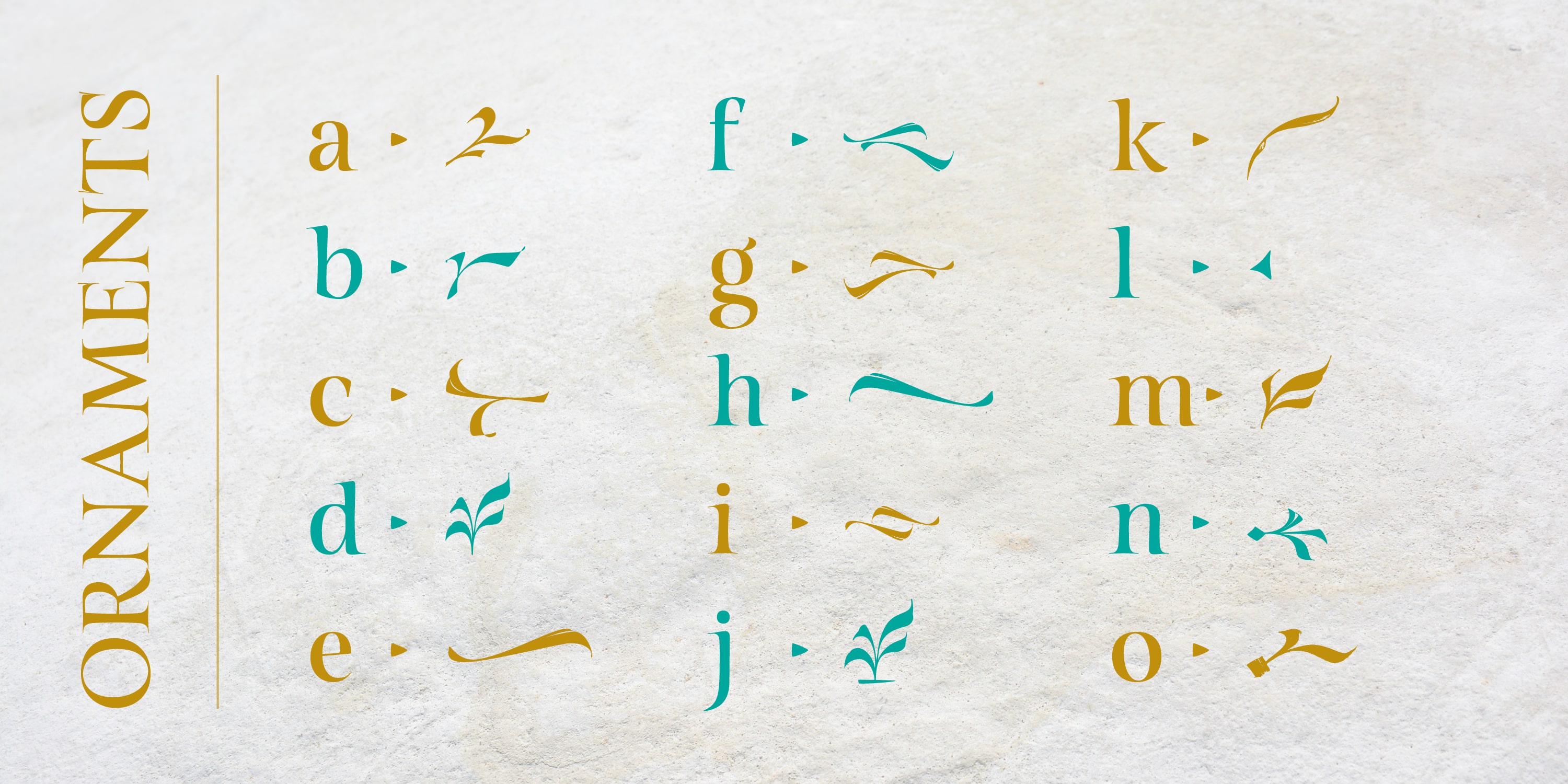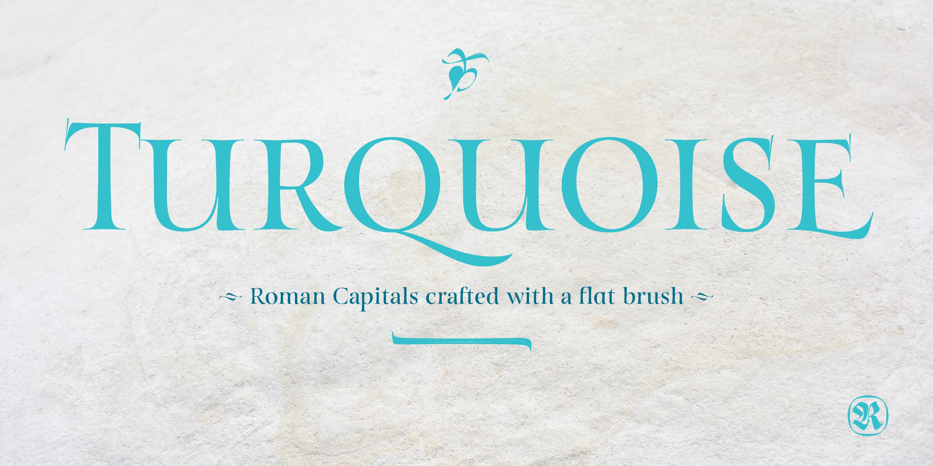 Designed by Resistenza Type FoundryOur goal was to design Roman Capitals that were smoothly designed with a brush, not carved. The main concept was based on the fundamental strokes that are commonly studied when you practice Roman letters. That’s why many Serifs have these unfinished terminal serifs. Turquoise contains small caps, many discretionary ligatures, ornaments, swashes as well as several brushy nature-inspired ornaments, accessible via OpenType. Ideally suited for headlines or body text in advertising, packaging and visual identities, its delicate shapes, curves and endings give projects a harmonious elegance and stylistic feel in unique Turquoise style.
