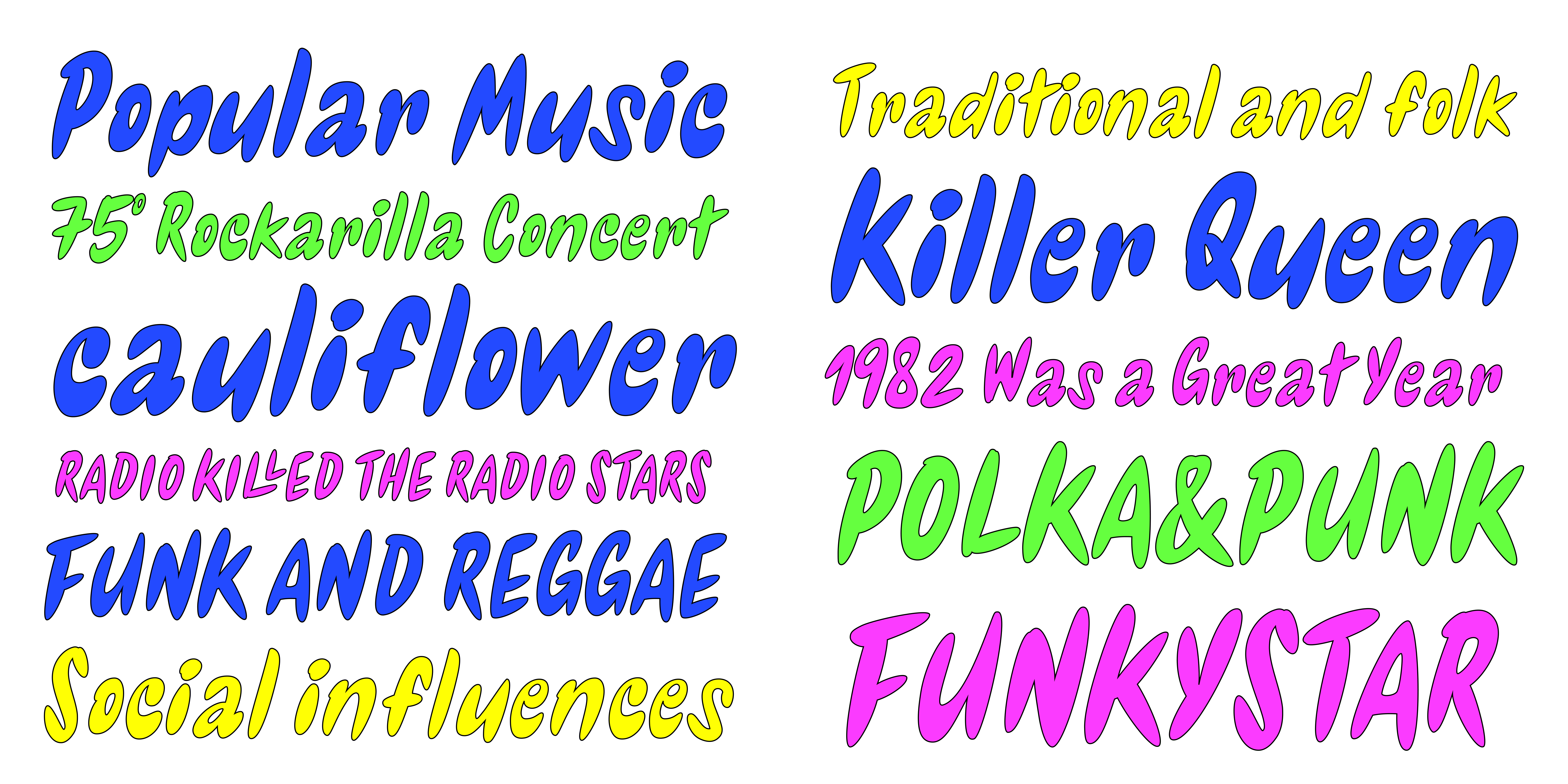 Designed by Resistenza Type FoundryVideomusic is a bubble font based on letterings from POP culture in the eighties. The edges have a pointed shape and a subtle inclination giving the dynamic touch used in many music television channels and videos from that fantastic era.